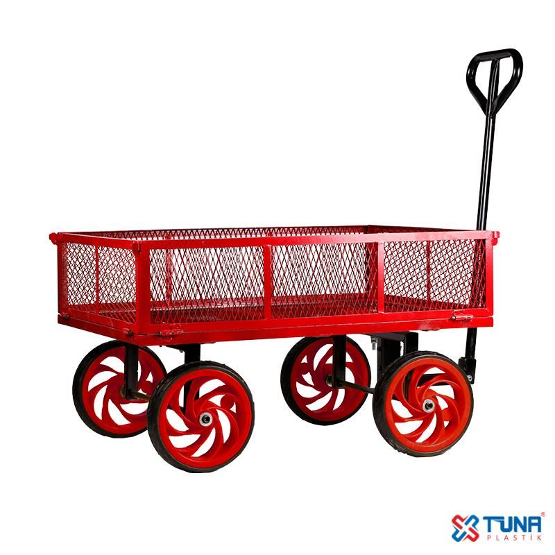 Açıklama : Bu ürünümüz, şasesi güçlendirilmiş kalın özel profil boru, L demir ve çelik teller ile güçlendirilerek statik fırın boya yöntemi ile kırmızı renkte üretilmiştir. Ürünümüz, tekerlekleri plastik jant havalı, midilli kauçuk, pvc kauçuk ve kauçuk seçenekleriyle sunulmaktadır. Bu ürünümüz, zeminine 4 adet meyve kasası yerleştirilebilecek standartlarda tasarlanmıştır. Sera, bağ, bahçe, sanayi, inşaat alanlarında kasa, saman, balya, çuval, odun, kömür gibi malzemeleri taşımada esnek ve ergonomik yapısıyla yıllarca kullanabileceğiniz ürünümüz size ve işinize kolaylık sağlar.